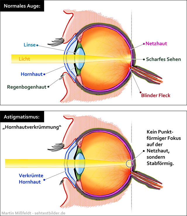 Bei Astigmatismus (Hirnhautverkrümmung), auch Stabdsichtigkeit genannt, ist die Wölbung der Augen-Hornhaut nicht gleichmäßig.