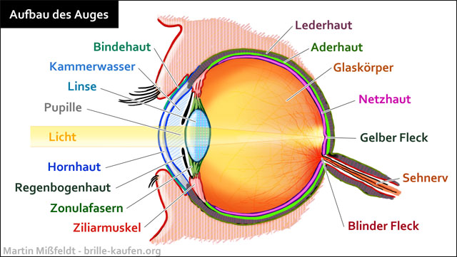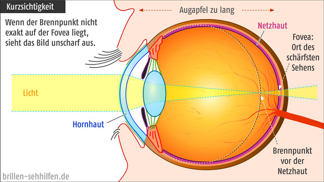 Die folgenden Grafiken veranschaulichen einige typische Fehlsichtigkeiten des Auges. Kurzsichtigkeit basiert auf einem zu langen Augapfel, gemessen an der Brechkraft des optischen Apparates (Hornhaut und Linse):