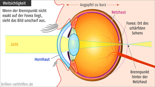 Bei Weitsichtigkeit ist es anders herum: der Augapfel ist gemessen an der Brechkraft des Auges zu kurz.