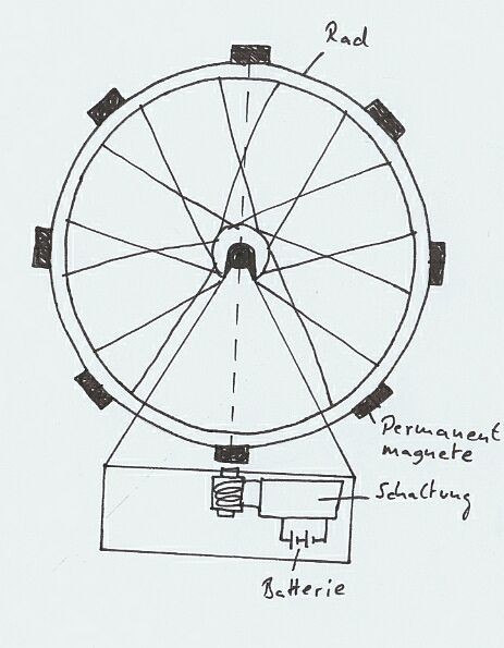 Hierbei sind auf einem frei beweglichen Laufrad am Rand Permanentmagnete angebracht. Wenn einer dieser Magnete an einer unterhalb des Laufrades angebrachten Spule vorbeikommen, induziert