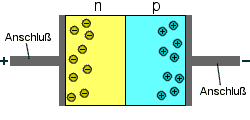 Eine Diode besteht aus zwei Schichten, einem n-dotierten und einem p-dotierten Halbleitermaterial, die sich berühren. Aufgrund von Abstoßung bzw. Anziehung von gleichen Ladungen