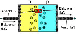 Eine Diode besteht aus zwei Schichten, einem n-dotierten und einem p-dotierten Halbleitermaterial, die sich berühren. Aufgrund von Abstoßung bzw. Anziehung von gleichen Ladungen